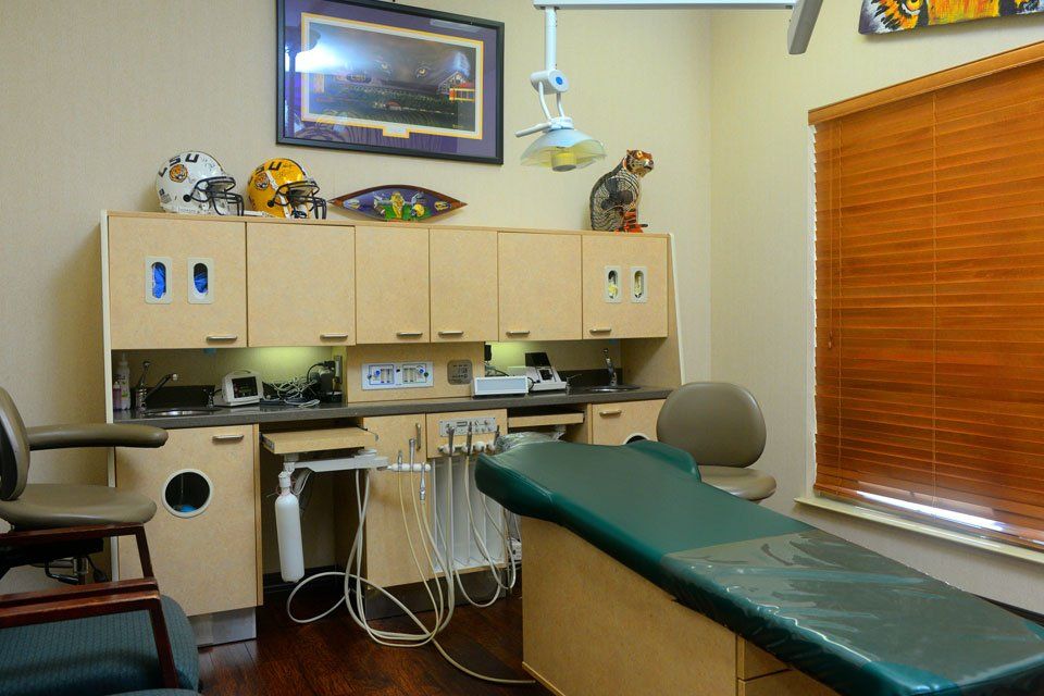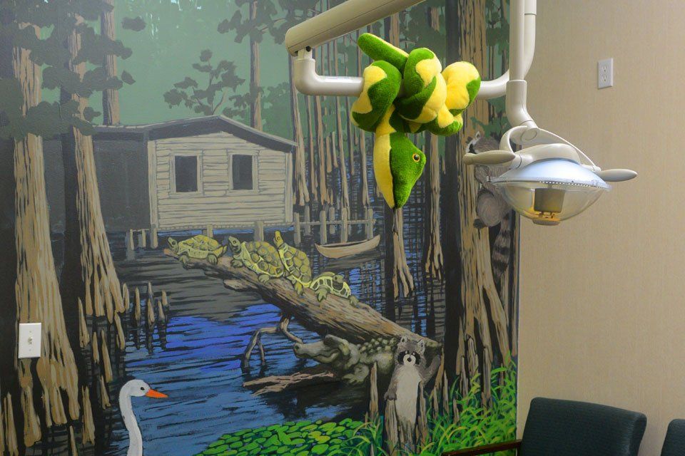 When your child is ready to be seen, which will never be a long wait, you will continue deeper into the jungle. You may sit among the elephants and giraffes, you may go with the alligators and turtles in our swamp room, or you may get to see Mike The Tiger in our LSU room! No matter where you are there will always be the added feature of your child having their own TV mounted to the ceiling for easy, relaxed viewing during their appointment.
